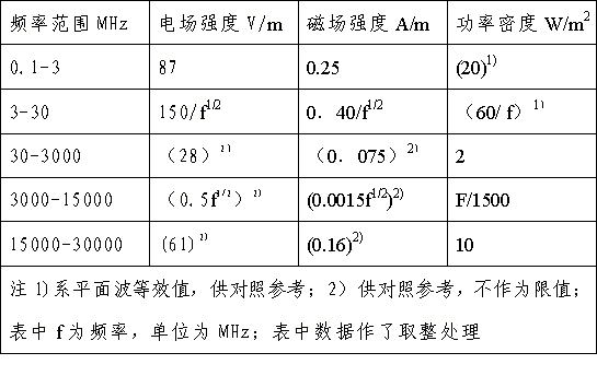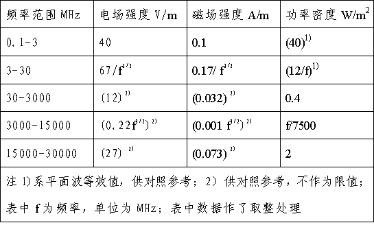 ¡¡¡¡2.1Ö°ÒµÕÕÉä:ÔÚÿÌì8Сʱ¹¤×÷ÆÚ¼äÄÚ,µç´Å·øÉ䳡µÄ³¡Á¿²ÎÊýÔÚÈÎÒâÁ¬Ðø6ÃëÖÓÄ򵀮½¾ùÖµÓ¦Âú×ã±í1ÒªÇó.